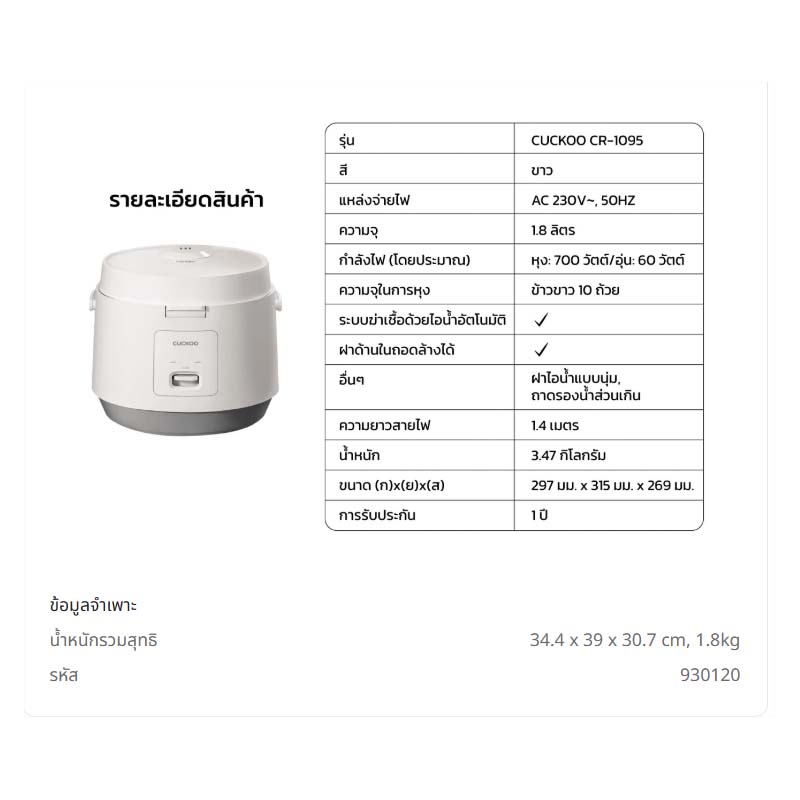 สิ่งที่ให้มาในกล่อง | หม้อหุงข้าว คุกคู CUCKOO ขนาด 1.8 ลิตร รุ่น CR-1095(By SuperTStore) | MODEL | หม้อหุงข้าว คุกคู CUCKOO ขนาด 1.8 ลิตร รุ่น CR-1095(By SuperTStore) |