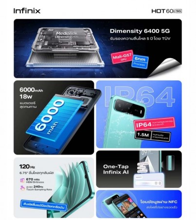 Infinix HOT 60i 5G 256+8GB (ผสานRAMสูงสุด16GB) I ชิปเซ็ต MediaTek D6400 I แบตเตอรี่ขนาดใหญ่ 6000mAh ชาร์จเร็ว 18W