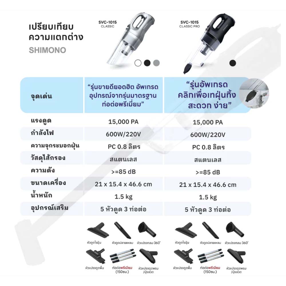 | สิ่งที่ให้มาในกล่อง | SHIMONO เครื่องดูดฝุ่นพลังไซโคลน รุ่น SVC1015 Classic (By SuperTStore) | MODEL | SHIMONO เครื่องดูดฝุ่นพลังไซโคลน รุ่น SVC1015 Classic (By SuperTStore) |