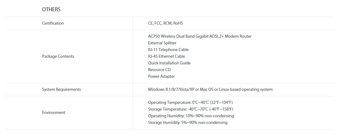 | สี | Black | สิ่งที่ให้มาในกล่อง | AC750 Wireless Dual Band Gigabit ADSL2+ Modem Router, External Splitter, RJ-11 Telephone Cable, RJ-45 Ethernet Cable, Quick Installation Guide, Resource CD, Power Adapter |