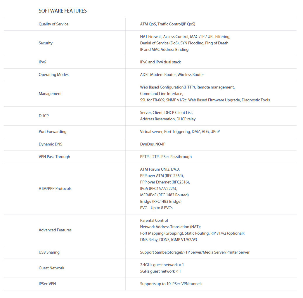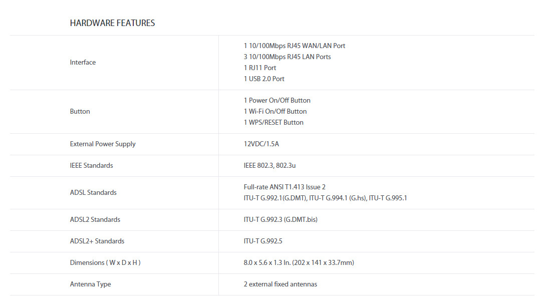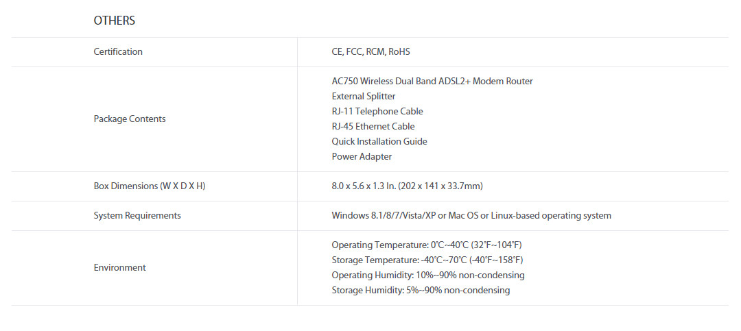 | สี | Black | สิ่งที่ให้มาในกล่อง | AC750 Wireless Dual Band ADSL2+ Modem Router, External Splitter, RJ-11 Telephone Cable, RJ-45 Ethernet Cable, Quick Installation Guide Power Adapter |
