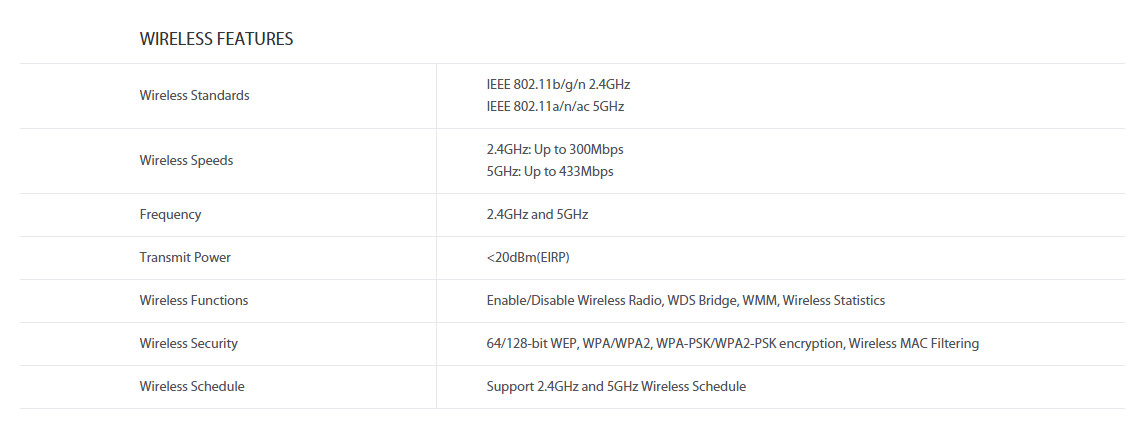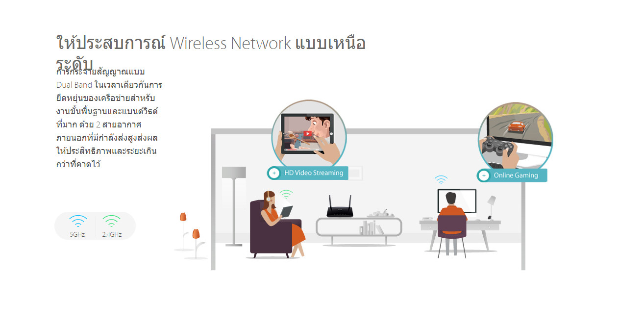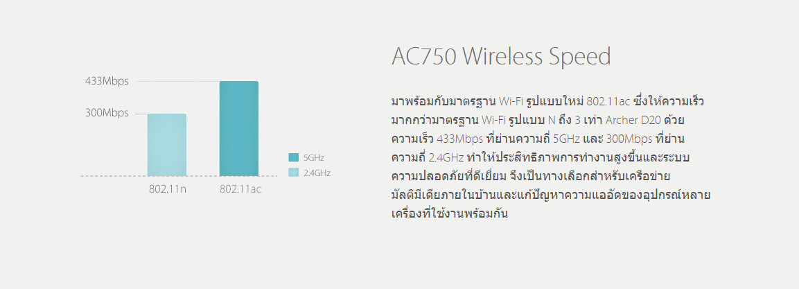 - เชื่อมต่อย่านความถี่ 2.4 GHz 300Mbps และ 5 GHz 433Mbps