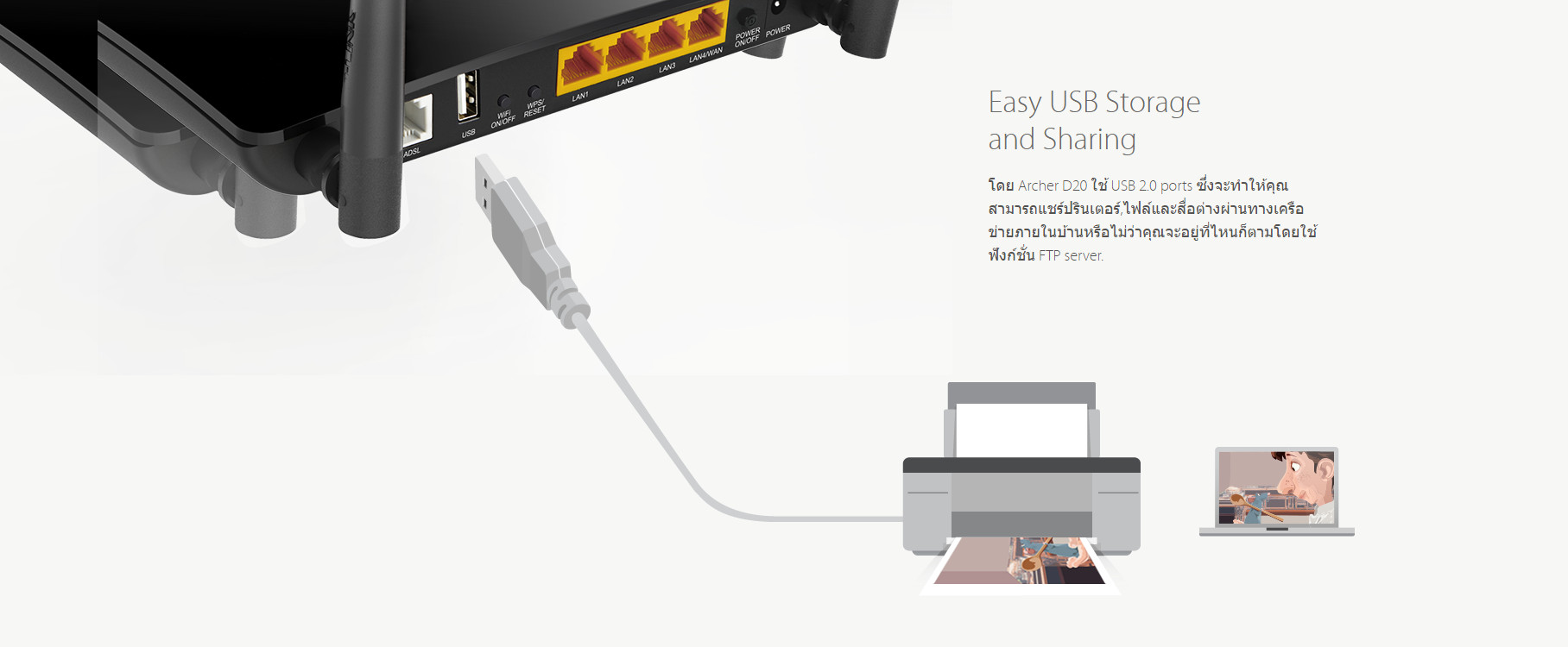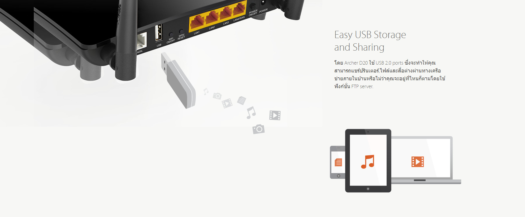 - พอร์ต USB สามารถแชร์ไฟล์ ภายในเครือข่ายเดียวกัน หรือเชื่อมต่อระยะไกลผ่านทาง FTP เซิร์ฟเวอร์