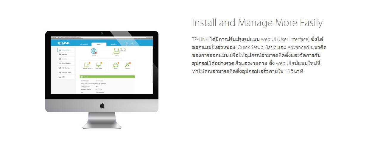 | Connectivity Speed (GHz) | Wireless Standards: IEEE 802.11b/g/n 2.4GHz, IEEE 802.11a/n/ac 5GHz, Wireless Speeds: 2.4GHz: Up to 300Mbps, 5GHz: Up to 433Mbps, Frequency: 2.4GHz and 5GHz | ขนาด (cm) | 20.2 x 14.1 x 3.37 |