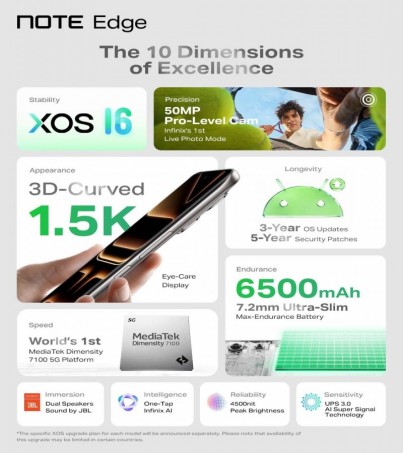 จุดเด่นที่สุดของ Infinix Note Edge คือดีไซน์ที่มีความบางเพียง 7.2 มม. และน้ำหนักเบา 185 กรัม มาพร้อมหน้าจอแสดงผลที่สเปคจัดเต็ม: